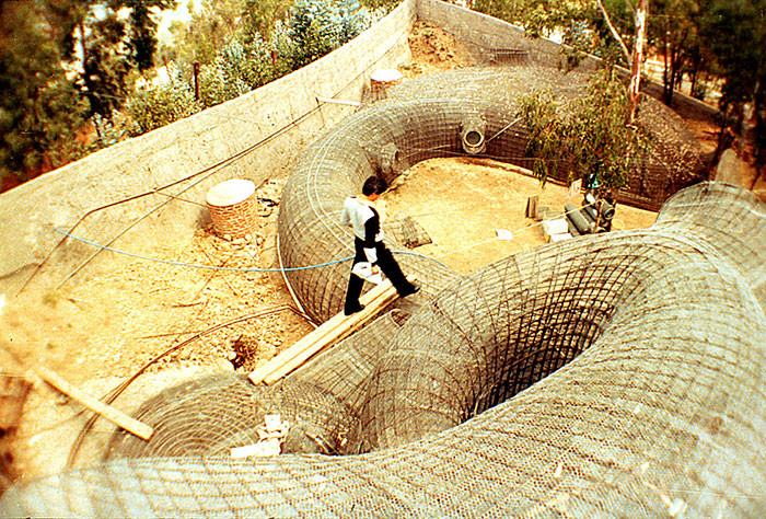 В процессе строительства необходимо было добиться той же преемственности, что и при проектировании. Для этого был использован формовочный очень пластичный материал, который позволил бы создавать любые формы, как из пластилина. В сочетании с этим требованием пластичности было очевидно, что при работе с домом материал должен удовлетворять требованиям, которые выходят за пределы скульптурной массы. исследование началось и вскоре сомнений не было: ферроцемент был правильным ответом.