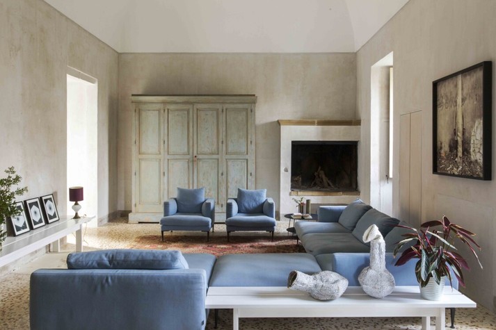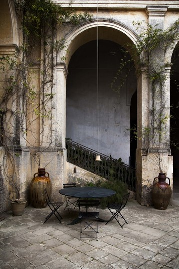 Расположенный в деревне Гальяно-дель-Капо в Апулии, где скалистое побережье Адриатического моря встречается с песчаными пляжами Ионического моря, палаццо располагает несколькими внутренними дворами с оранжереей и бассейном.