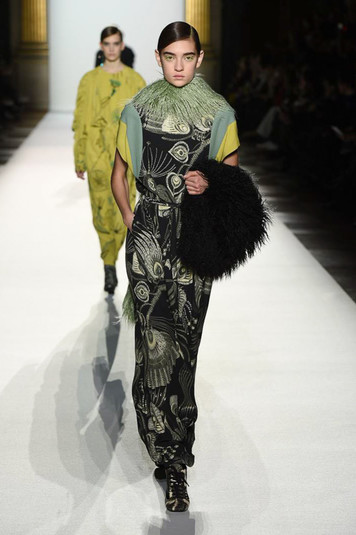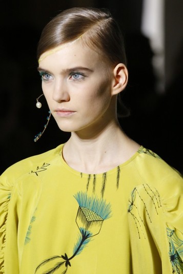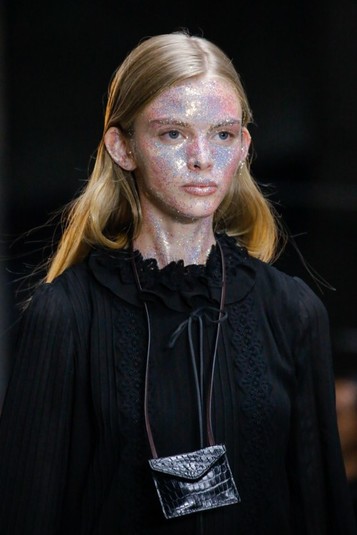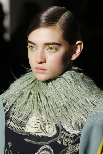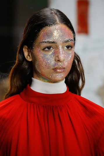 Giambatista Valli покрыл лицо девушек большим глиттер, что маской. Для шоу Dris Van Noten стилист Сэм Макнайт и визажист Питер Филипс придумывали образы, в которых декорированы перьями проборы рифмовались с цветными ресницами тона, который соответствовал наряду.