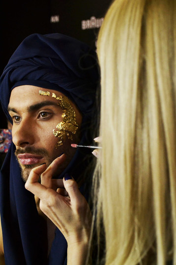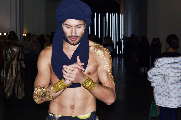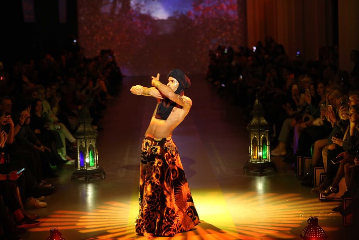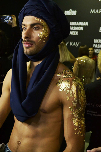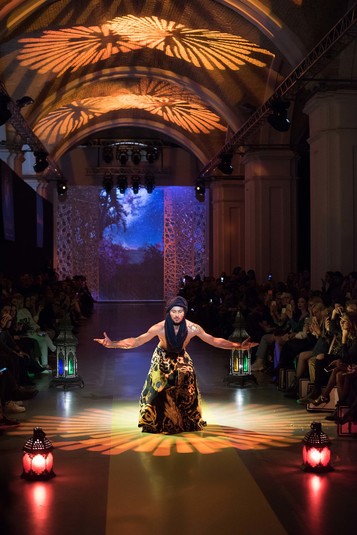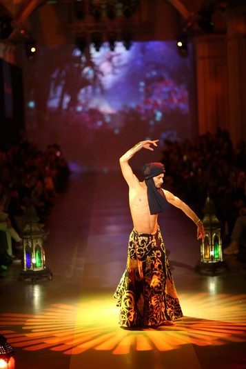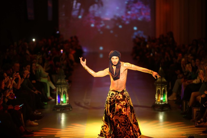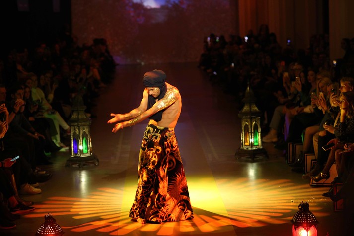 Под аккомпанемент восточной музыки, будто из сказки про Алладина, на подиуме Ukrainian Fashion Week, украшенном лампами из хевронского стекла, появился Александр в традиционном восточном наряде.