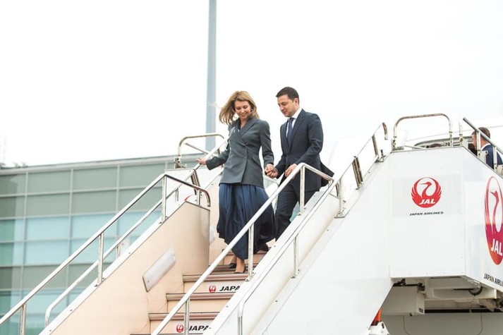 На фото запечатлели, как Владимир Зеленский вместе с супругой спускаются по трапу самолета, в аэропорту их ожидает японская сторона.