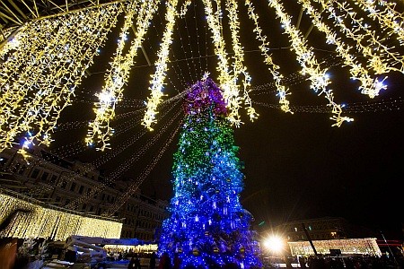 Уже четвертый год подряд главную елку страны зажигают именно на Софийской площади. На этот раз само дерево привезли из Ивано-Франковской области. Ее высота достигает рекордных 29 метров. А возраст дерева – 91 год. Елку украшает 500 фонариков. Также впервые на дереве подсвечиваются игрушки. Общая протяженность неоновых гирлянд, которыми украшено дерево, составляет более 3,5 км.
