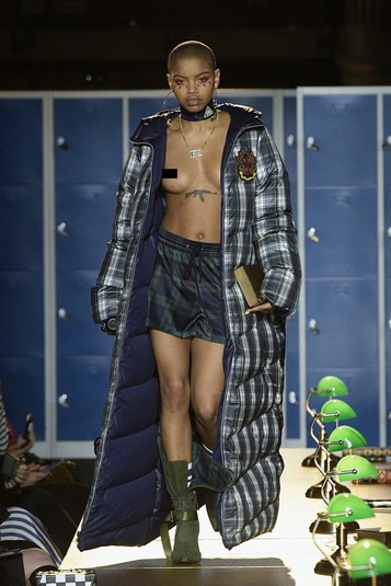 Шоу открыла модель с обнаженной грудью, которую едва прикрывал длинный пуховик. Верхняя одежда покрыта клетчатым принтом. Образ дополнен большим количеством аксессуаров, зелеными сапогами и книгой, имитирующей клатч.