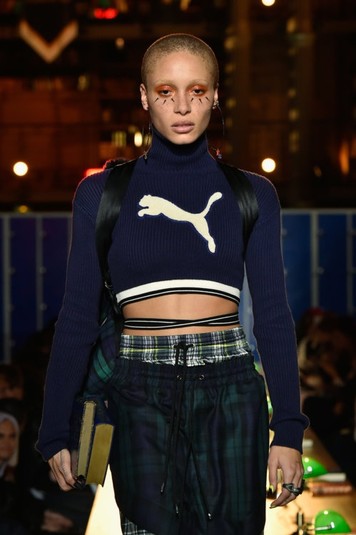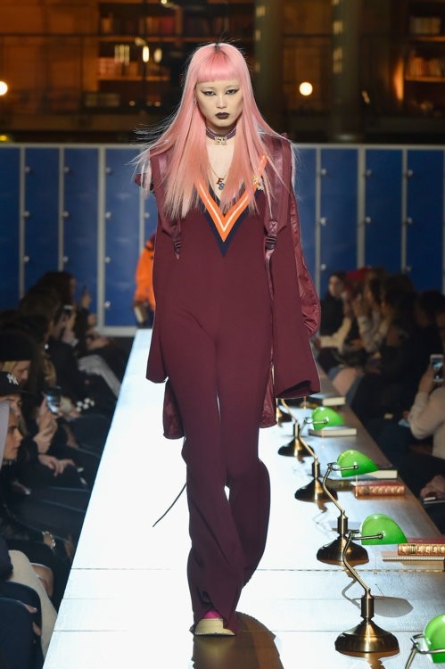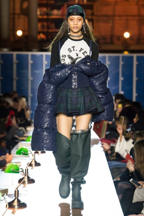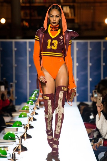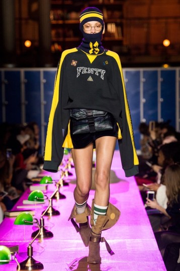 Певица и дизайнер Рианна представила в Париже новую коллекцию бренда Fenty x Puma осень-зима 2017/2018. Показ прошел в Национальной библиотеке Франции. Модели шагали прямо по столам, заставленных зелеными настольными лампами и толстыми книгами.