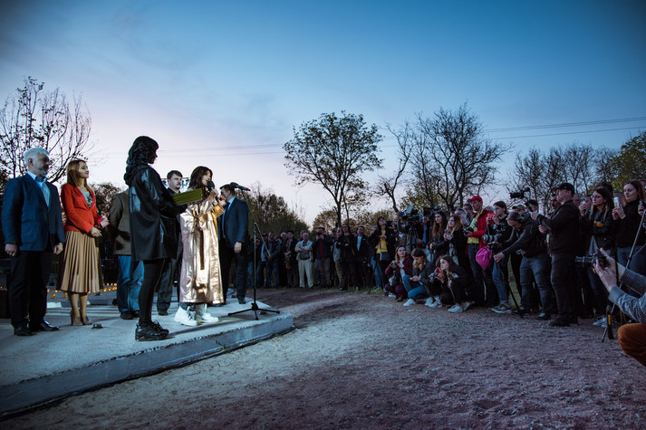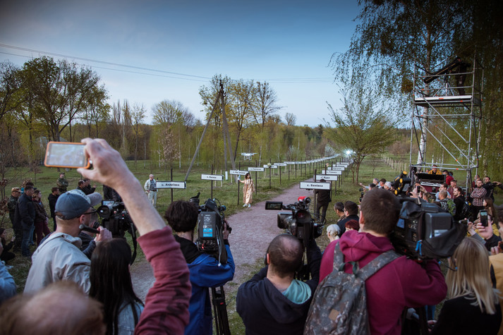 Зрители и гости арт-перформанса собрались на площади возле «Трубящего ангела» - символического монумента, который означает две противоположные по своей сути вещи - надежду на лучшее и наказание за грехи. Присутствующие почтили память ликвидаторов катастрофы на ЧАЭС минутой молчания. Арт-перформанс «Чорнобиль RE:start» начался на аллее брошенных сел, по обе стороны которого установлены 162 таблички из названий эвакуированных населенных пунктов - сел, что стали «призраками».