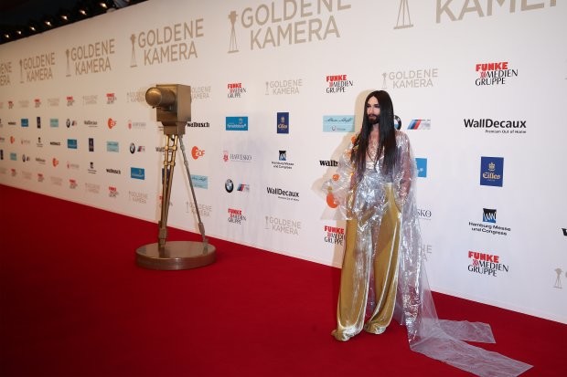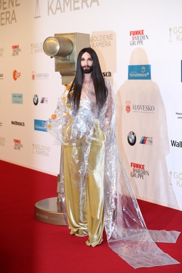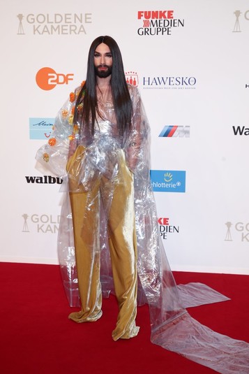 Эпатажная победительница песенного конкурса «Евровидение-2014» Кончита Вурст ппришла на церемонию вручения премий Golden Camera Awards-2018 в Гамбурге в эксцентричном платье. Австрийская звезда продемонстрировала эффектный прозрачный плащ, выполненный из пластика.