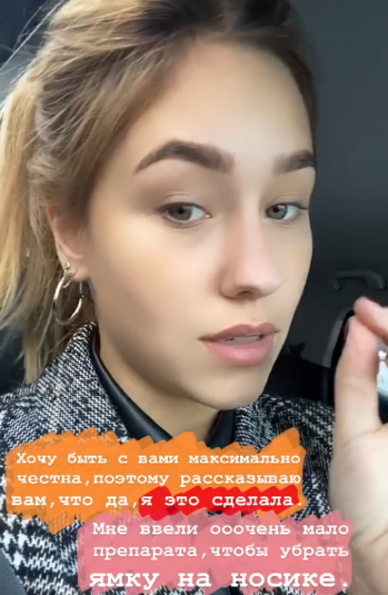 После того, как процедура прошла успешно, Даша решила поделиться впечатлениями с поклонниками. «Хух. Я это сделала. Теперь у меня носик ровный, без ямочки. Это не больно. Это неприятно. Чуть-чуть мне ввели гиалуроновую кислоту и просто убрали эту ямочку. Но не заметно, лицо не распухнет, поэтому все в порядке », - заверила она.