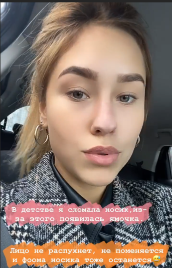 Обеспокоенные поклонники стали уточнять, какое же косметическое или хирургическое вмешательство предстоит девушке. «Не будет никакой операции. Носик останется прежним, просто ямочка уйдет », - пояснила девушка. И затем добавила в видеообращении: «Нос не будет другого размера или по другому выглядеть».