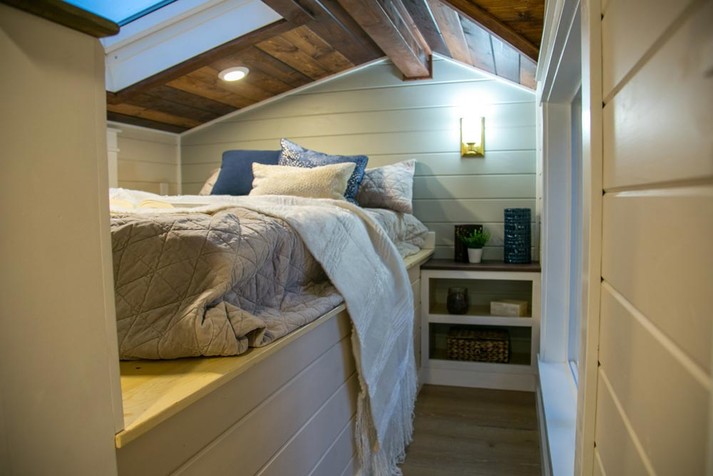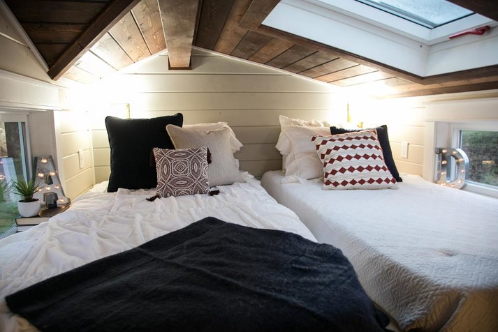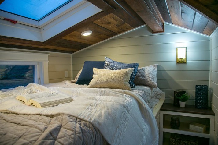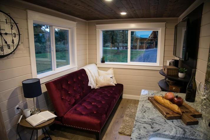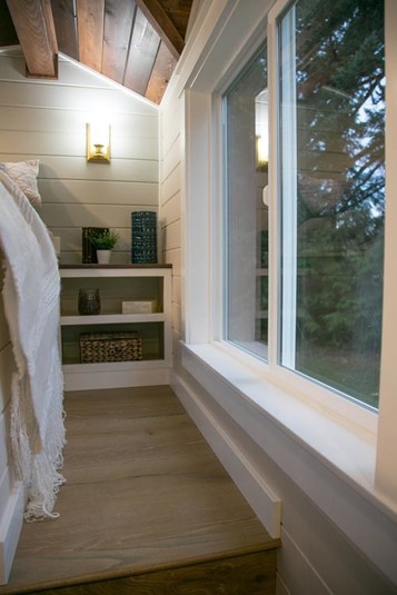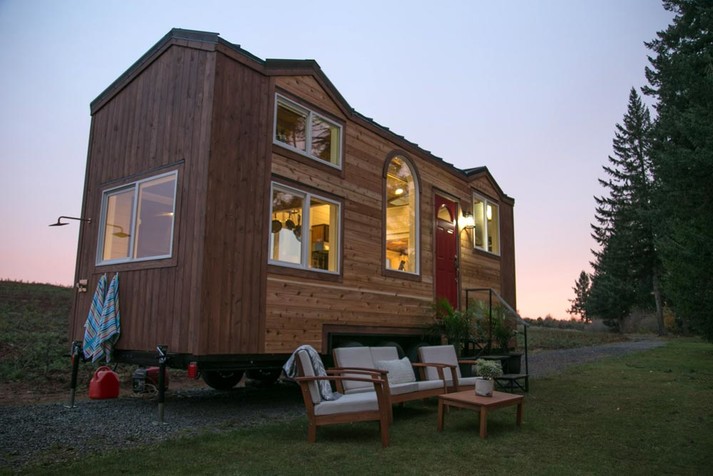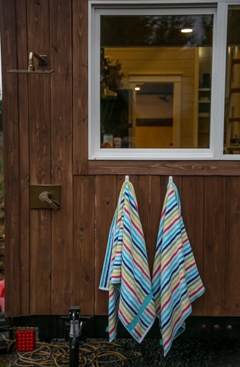 Мобильное жилище обшито кедровым сайдингом и увенчано металлической крышей. В трейлере стильная дверь и девять достаточно больших, по меркам домов на колесах, окон. В глаза также бросается небольшой душ, который расположен снаружи жилья.