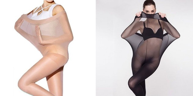 На снимках стройные модели с головой залезают в капроновые колготки и растягивают их руками, демонстрируя эластичность вещи.
