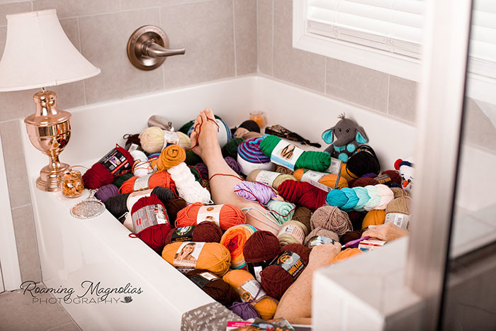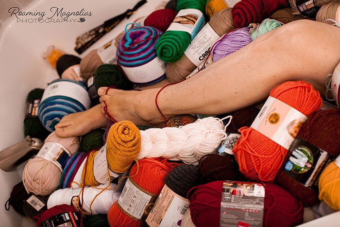 «Итак, моя мама Лиза Бишоп хотела, чтобы я сфотографировала ее, но с одним условием... Она хотела сделать это в ванной, полной пряжи. Мы сделали это, и я назвала эту серию фотографий «Бабушка слетела с катушек». Мама подарила эти снимки моему отцу на Рождество. И его очаровательная реакция школьника повысила ценность этих фотографий в тысячу раз!»