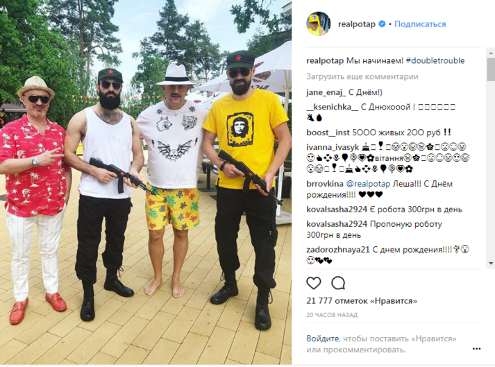 На своей странице в соцсети Instagram музыкант поделился фотографиями с вечеринки. «Мы начинаем! #doubletrouble», «Вот подкатила партия псов из Кубы. Ребята дикие, будь аккуратен», - написал Потап под одним из снимков.