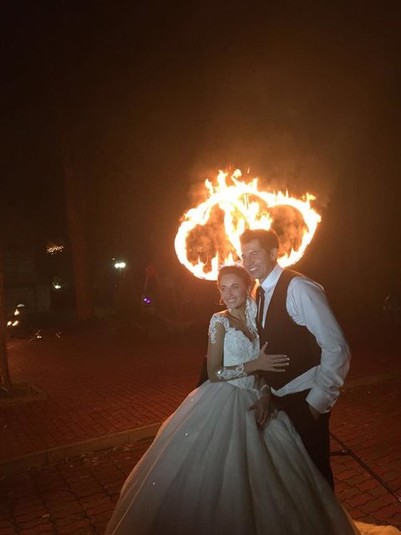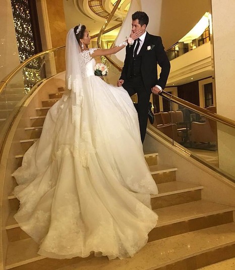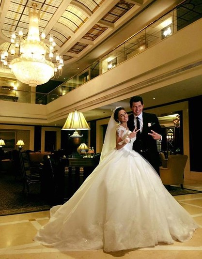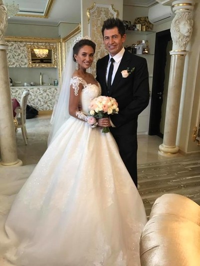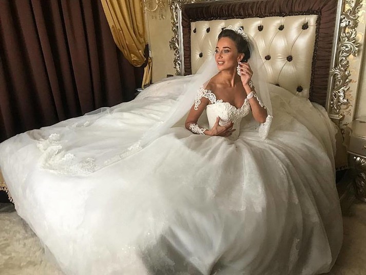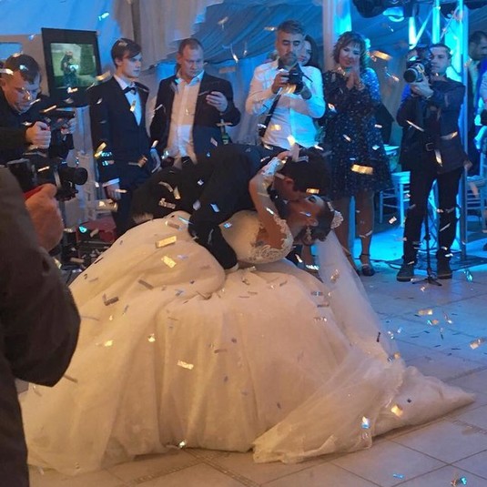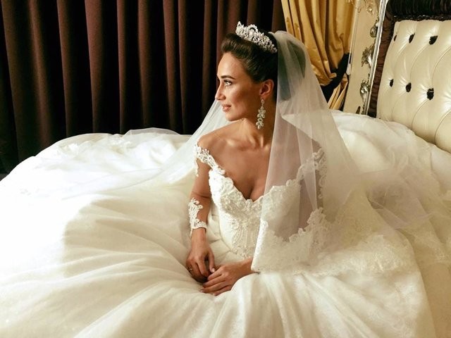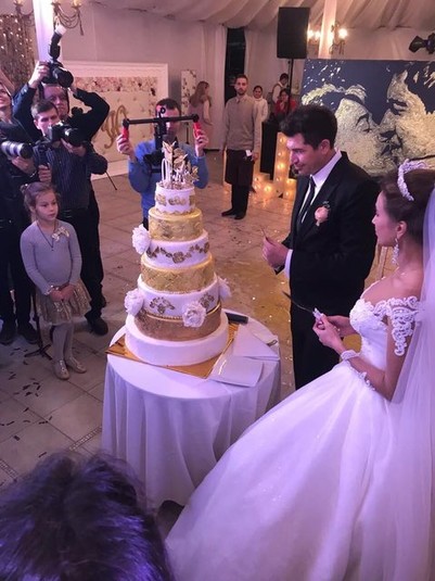 Для свадьбы Юлия Леус выбрала пышное платье с длинным кружевным шлейфом. Пара угощала гостей необычным многоэтажным караваем.