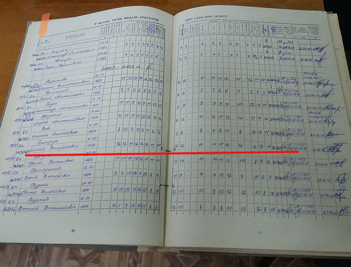 «Вот, смотрите, Гончарук Алексей Валерьевич. Выпуск 2001 года. 12 по «Украинскому языку», по «Литературе», «Всемирная история», «История Украины», «География». Почти все гуманитарные науки - высший балл. «Физика», «Алгебра», «Геометрия», «Химия»- 11», - рассказала директор лицея, где получил среднее образование Гончарук.