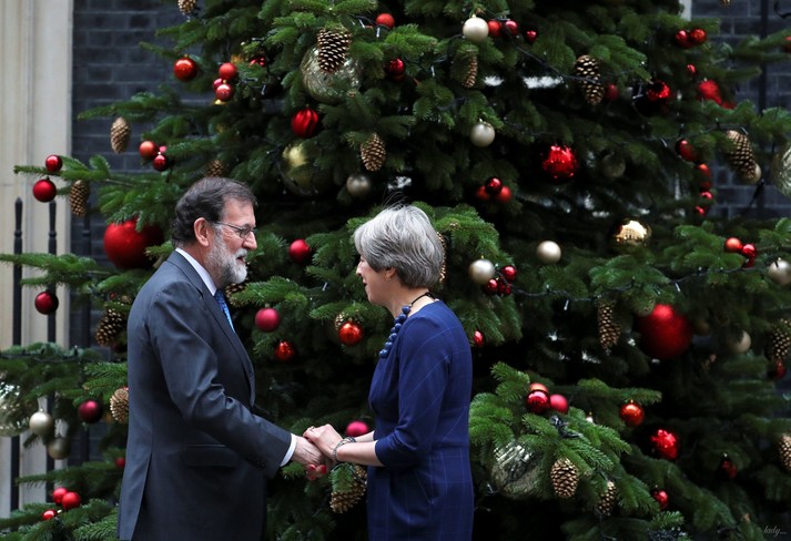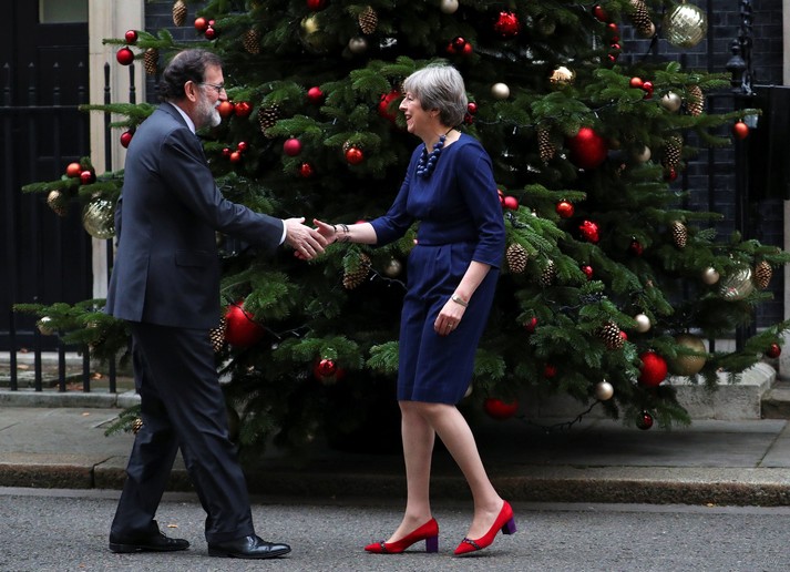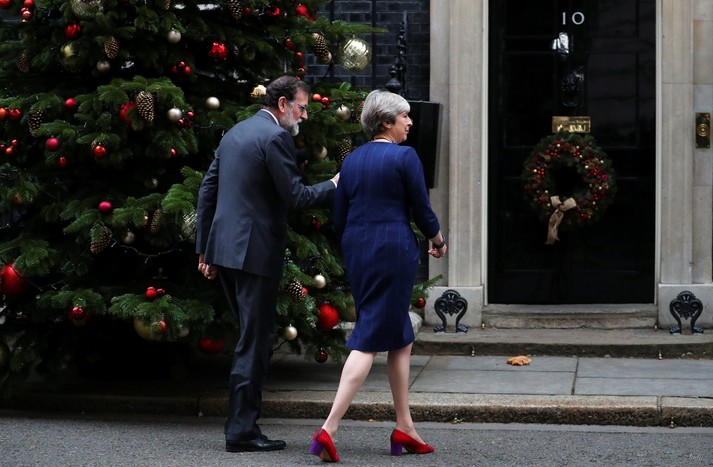 Глава правительства Великобритании Тереза Мэй во время встречи с премьер-министром Испании Мариано Рахоем выбрала стильное синее платье в клетку, которое дополнила красными туфлями. Эта обувь вызвала активные обсуждения у пользователей. Многие из которых отметили, что их яркий цвет хорошо гармонирует с елочными игрушками.