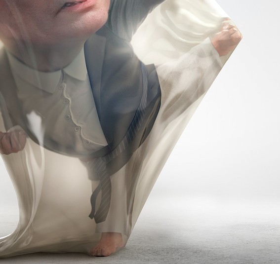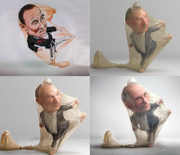 Путин изображен внутри контрацептива в пиджаке и рубашке и штанах для дзюдо. Он находится в боевой позиции, словно пытается нанести удар.