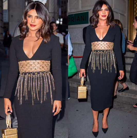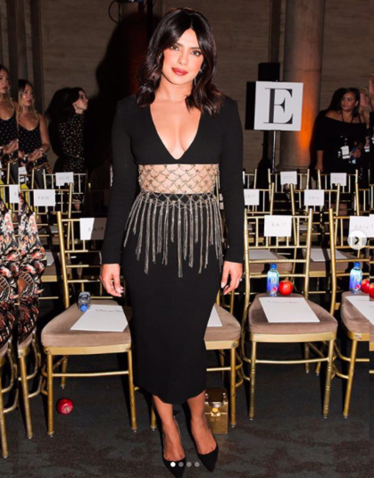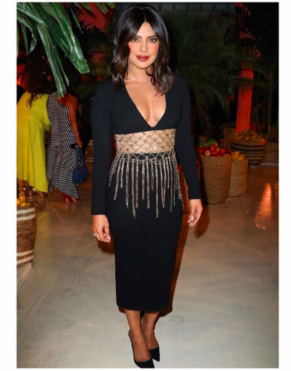 Посмотреть на стильные новинки 37-летняя Приянка Чопра пришла в черном платье от бренда Oscar de la Renta, которое имело длину миди. На талии наряд был прозрачным и декорирован золотыми цепочками.
