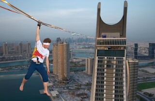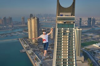 Естонець пройшов 150 метрів тросом на висоті 40 поверхів у Катарі. Сильний вітер не завадив йому встановити рекорд, пише Euronews.