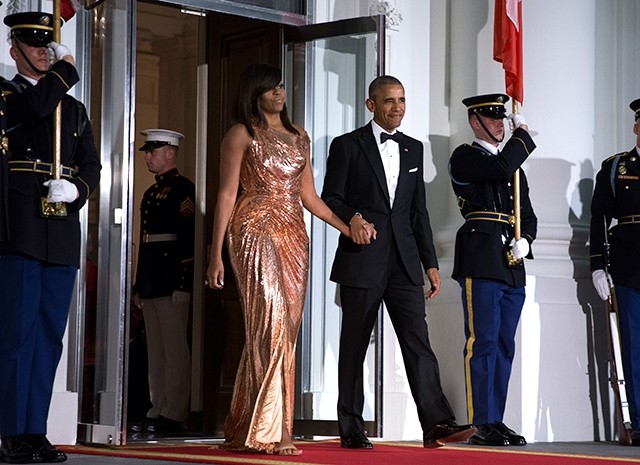 Вечер начался с традиционной фотосессии у дверей Белого дома. Мишель Обама обеспечила себя повышенным вниманием, появившись перед гостями в сверкающем платье Atelier Versace: первая леди США последовала своей традиции выбирать платья дизайнеров тех стран, откуда приезжают визитеры, и не прогадала - наряд сидел на ней великолепно! Сделав несколько снимков для "протокола", главы государств и их супруги переместились в холл для приветственного фуршета, а далее - в зал на торжественный ужин.