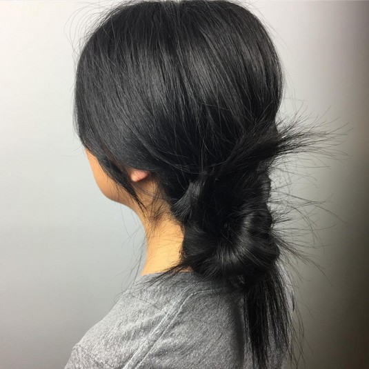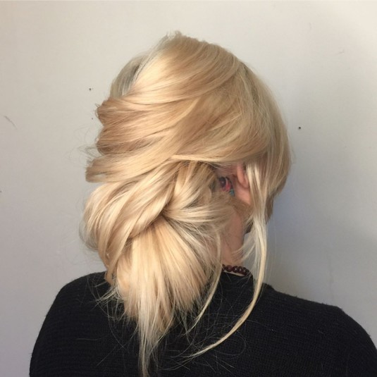 Сначала следует завязать пряди в асимметричный низкий хвост. Волосы обернуть вокруг своей оси и свернуть в свободный пучок. Результат зафиксировать невидимками. Прическа должна создавать эффект небрежности.