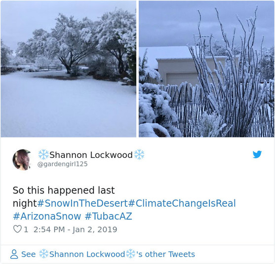 В социальные сети уже попали десятки снимков снега в пустыни Аризоны и Нью-Мексико. Настоящее Рождество и снежный Новый год охватили регион. Только в Нью-Мексике выпало от 46 до 51 сантиметра снега.