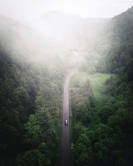 «После драматического утра, когда мы чуть не утопили свою машину в реке, а затем вытащили потерявшегося молодого француза, мы достигли долины Торсмерк на юге Исландии. Мы подошли к точке обзора, откуда могли видеть... совершенно ничего, из-за тумана. После долгих ожиданий завиднелся автомобиль, придавший ощущение масштаба к горному ландшафту».