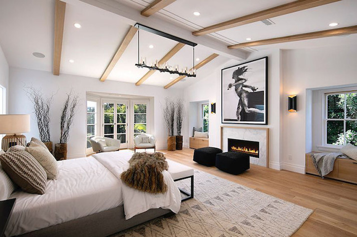 Интерьер особняка выполнен в светлых тонах и эко-стиле. Одна из спален Хейли и Джастина светлая, с деревянными элементами и картиной на стене.