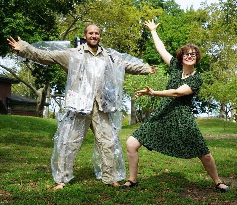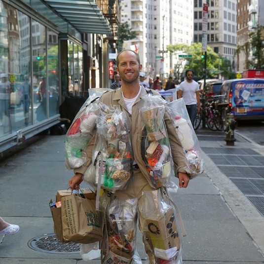 Житель Нью-Йорка шокирует горожан, разгуливая по улицам в костюме, состоящем из созданного им за месяц мусора.