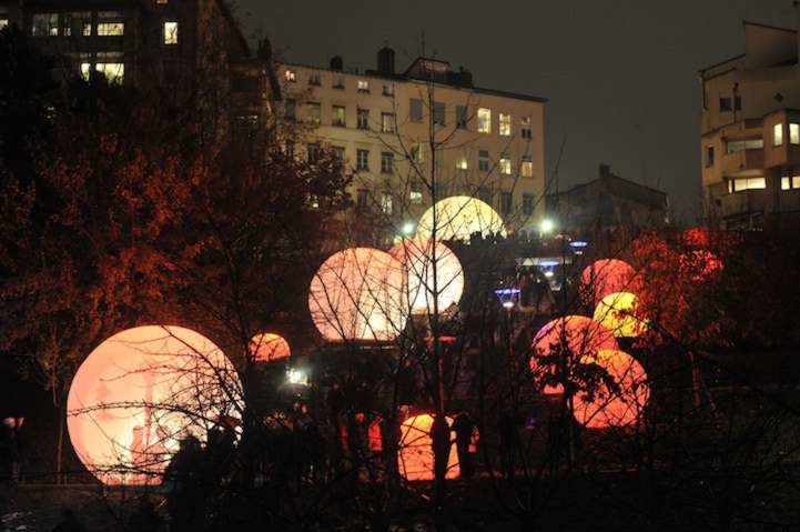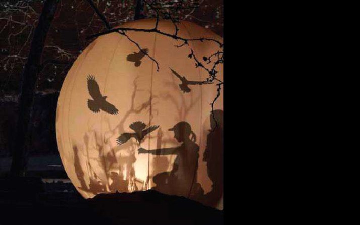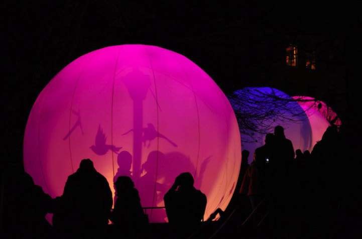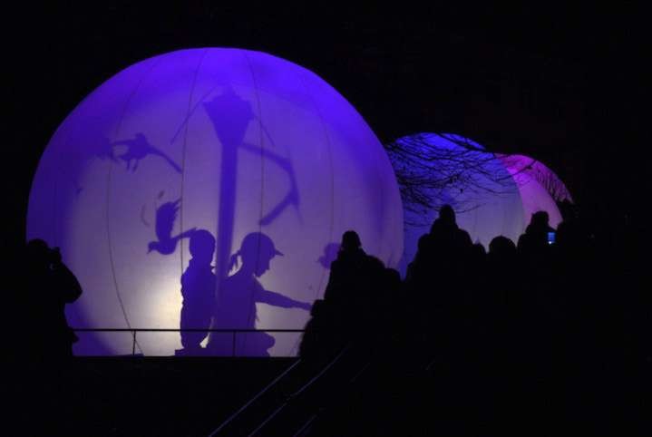 Один из организаторов этого мероприятия, канадский коллектив Lucion Media, завлекают посетителей в парк Grande Côte с помощью огромных ярких шаров, меняющих цвета. Когда гости проходят по лестнице, они видят 12 больших пузырей, пять из которых населяют птицы в вольерах, клетках и гнездах. Вот и получается волшебный театр теней!