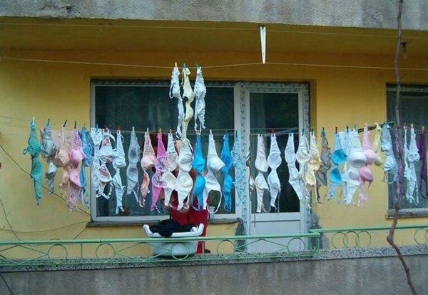В свою очередь девушки кокетливо вывешивают сушиться на балконах нижнее белье. Десятки ярких трусиков и бюстгальтеров различных размеров и форм.