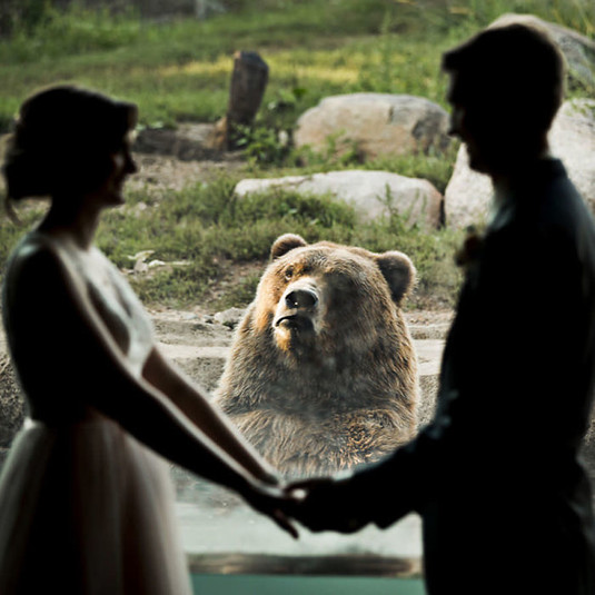 Одна пара решила пожениться в зоопарке Миннесоты. А когда они получили свадебные фотографии, то их ожидал сюрприз — на снимках запечатлен медведь гризли, который внимательно наблюдает за новобрачными. И выражение его морды крайне красноречиво.