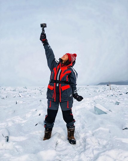 «Как же я люблю путешествия! Сегодня я в зиме, здесь -25, подо мной полтора метра льда и озеро Байкал», – подписала она фото. Также она добавила, что отправилась на это озеро для съемок очередного видео для своего vlog'а.