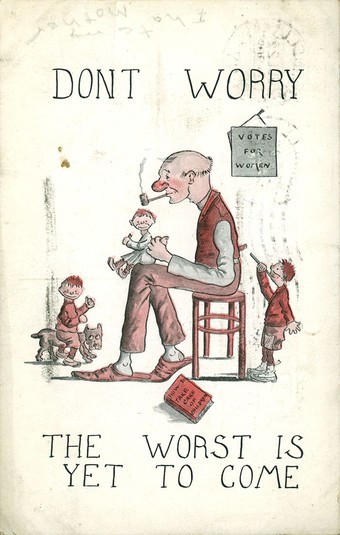 Открытки изображали идею перемен как нечто ужасное, чего стоит бояться, а не стремиться к этому. Они представляли права женщин как угрозу семейным ценностям и покушение на статус мужчины в обществе. Хотя нам еще далеко до равноправия мужчин и женщин, эти открытки служат неплохим напоминанием о том, как человечество далеко продвинулось в этом вопросе за XX век.