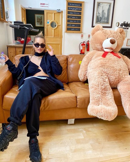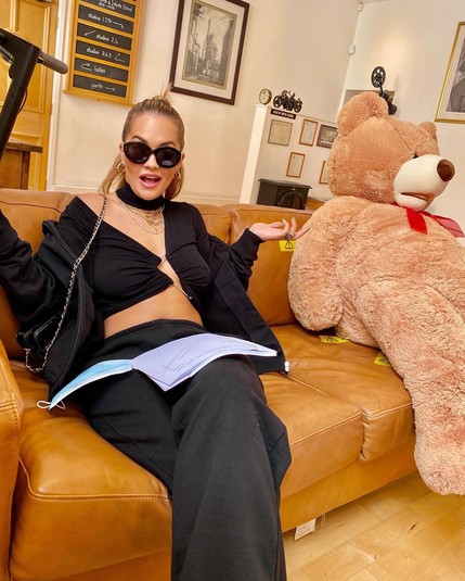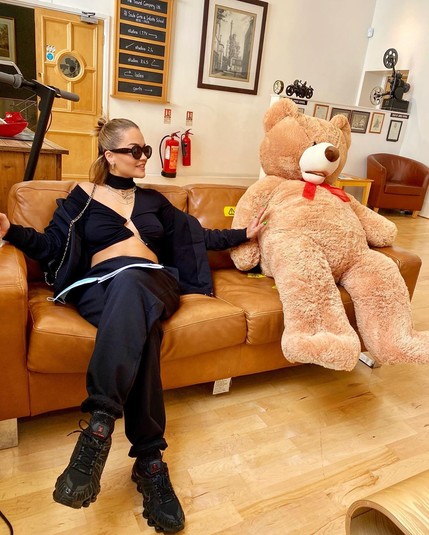 На размещенных в сети кадрах 29-летняя исполнительница позирует на диване рядом с плюшевым медведем. На фото она одета во все черное: просвечивающий грудь облегающий кроп-топ, джоггеры с завышенной талией, куртку и кроссовки. Ее образ дополнили сумка, солнцезащитные очки и множество аксессуаров: подвески, серьги и кольца. «Приятель, я просто пытаюсь работать», — подписала Ора пост, набравший больше 150 тысяч лайков.
