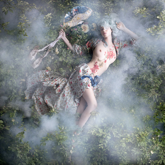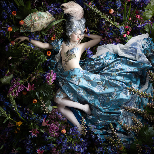 Новая коллекция изображений Алексии Синклер так и называется – «Рококо». Для её создания потребовалась масса усилий. Например, чтобы снять один из кадров, вручную раскрасили белой краской сотни шёлковых цветов, придав им сходство с фарфором, который так любила маркиза де Помпадур.
