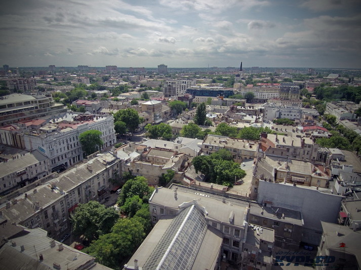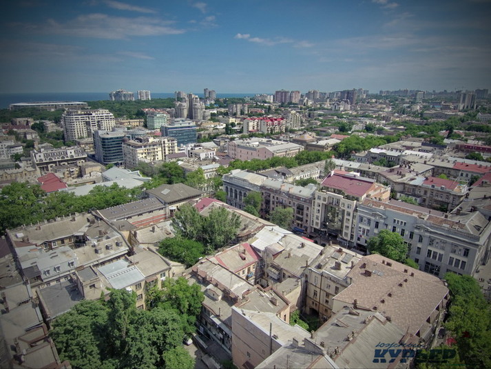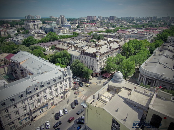 Затем поднялся чуть выше и позволил увидеть город с высоты около сотни метров. С этой точки уже видно, как вокруг самых красивых и известных мест центра Одессы практически везде выстроены современные высотные здания - возведение которых, особенно вдоль красных линий улиц, прямо запрещает Генеральный план города.