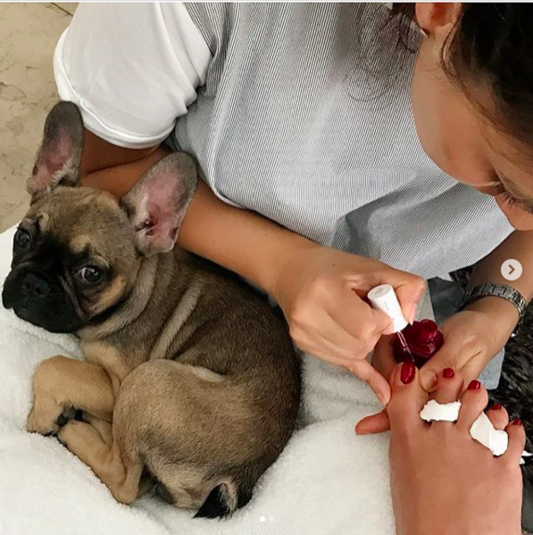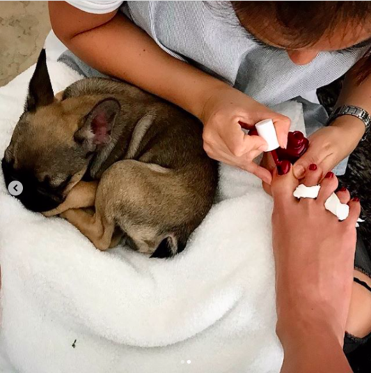 На снимке видно, что Би послушно лежит на махровом полотенце на коленях у мастера, пока ее звездной хозяйке красят ногти.