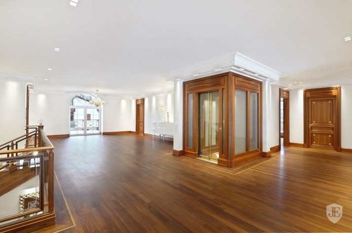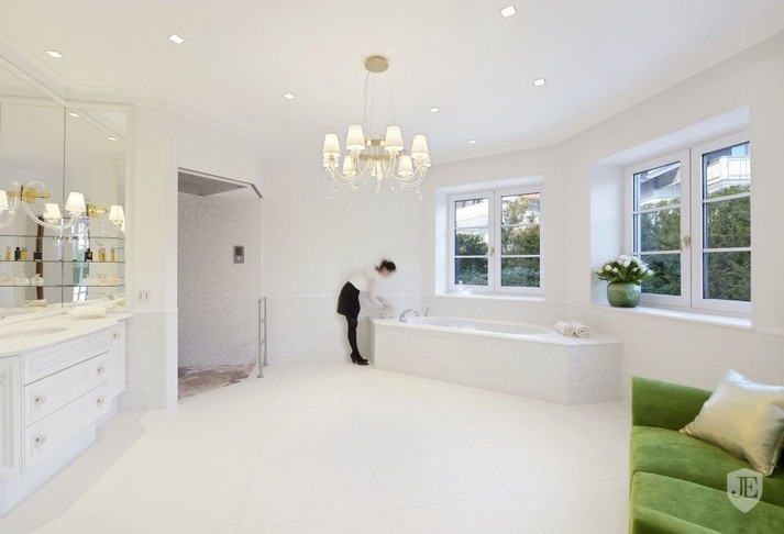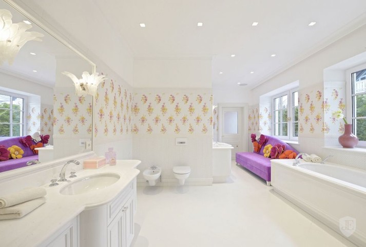 «Здесь были использованы только самые изысканные материалы высочайшего качества. Люстры в стиле рококо венчают собой залитые светом залы, мраморный пол излучает атмосферу дворца итальянской знати. Над интерьером работал один из самых известных дизайнеров Мюнхена», – говорится в объявлении о продаже.