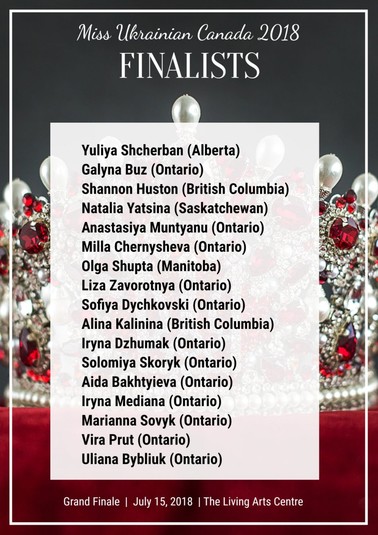 17 жительниц Канады украинского происхождения попали в финал конкурса красоты Miss Ukrainian Canada 2018. Это традиционный ежегодный конкурс, который проводится среди представительниц украинской диаспоры. За звание самой красивой будут соревноваться девушки из провинций Онтарио, Квебек, Саскачеван, Манитоба, Альберта, Британская Колумбия, Новая Шотландия и Нью-Брансуик.