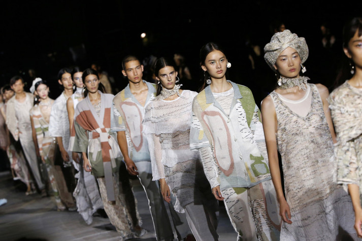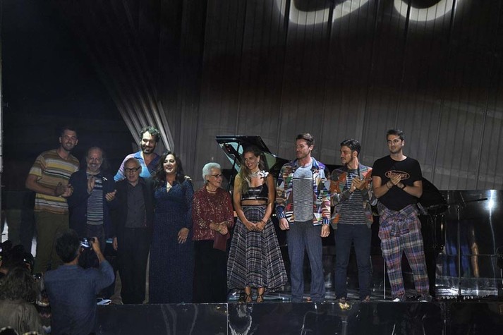 Юбилейное шоу Missoni прошло на открытой площадке, зрители сидели за столиками в импровизированном кафе, а модели шагали между ними. Главным в знаковой коллекции стол тот самый принт, который в новом сезоне больше напоминал нежные акварельные разводы, а модели в этих напоминающих облако многослойных одеждах выглядели, как лесные нимфы. А в финале показа семья Миссони вышла на сцену летнего театра полным составом.