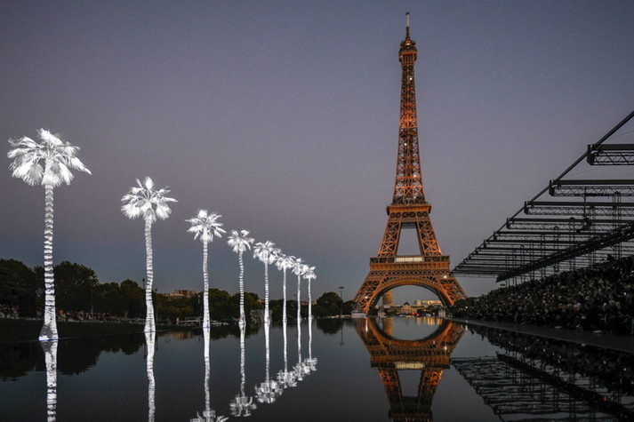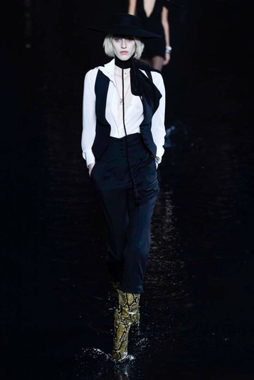 Свою новую работу Энтони Ваккарелло для Saint Laurent решил показать у подножья Эйфелевой башни, а именно на площади Трокадеро. Подиум был по щиколотку залит водой и в ней отражались белые искусственные пальмы. В атмосфере вечернего Парижа такие декорации выглядели особенно эффектно.