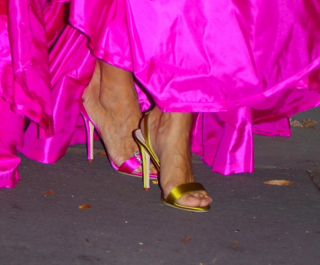 Создал его Зак Позен – один из любимых дизайнеров американской публики. Не обошлось в образе и без сюрпризов – вместо ожидаемого миниатюрного клатча Паркер взяла с собой сумку-мешок, усеянную блестками, а завершила образ разноцветными босоножками.