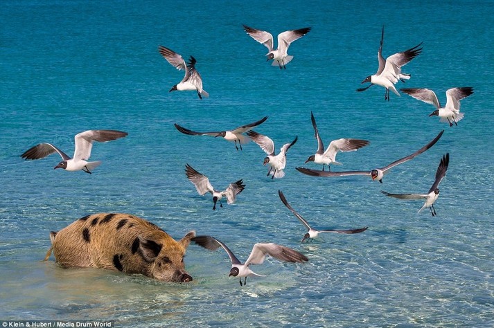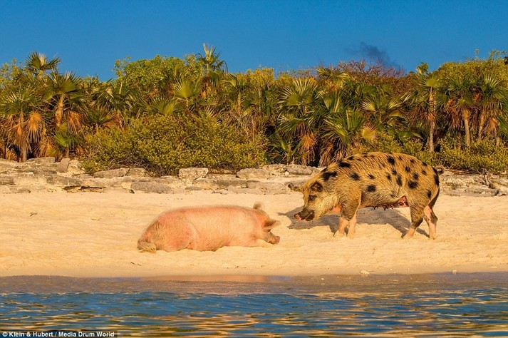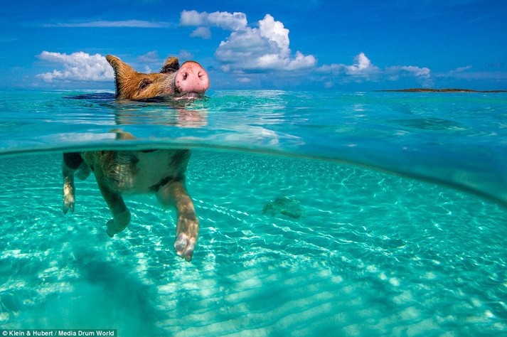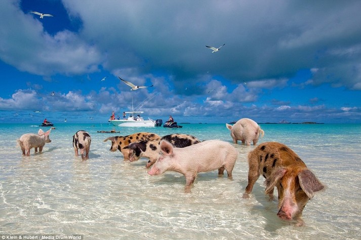 Хрюшки бегают вдоль берега, загорают на солнце и плавают в теплой бирюзовой воде, зачастую отплывая от берега на добрую сотню метров, чтобы поприветствовать туристов на яхтах. Вопрос, как свиньи вообще нашли сюда дорогу, остается открытым. Но каждый из нас просмотрев этот фоторепортаж захочет поменяться местами с этими смешными пяточками хотя бы на неделю.