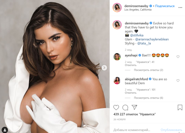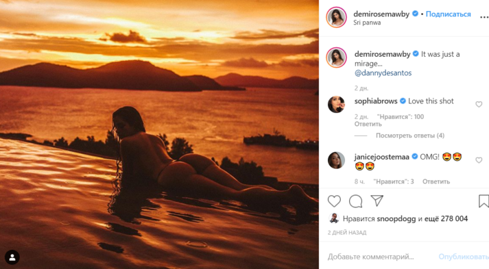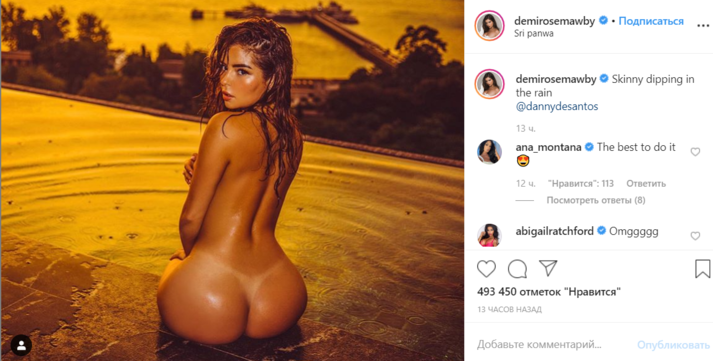 24-летняя брюнетка с женственными формами Деми Роуз продолжает покорять просторы Сети. Деми часто устраивает дерзкие фотосессии и показывает свои достоинства. Инстадива решила напомнить о своей яркой внешности, по поводу которой часто получает комплименты. Она продемонстрировала тело, раздевшись до крошечных стрингов. Деми легла на живот, акцентируя всеобщее внимание на пышных бедрах.
