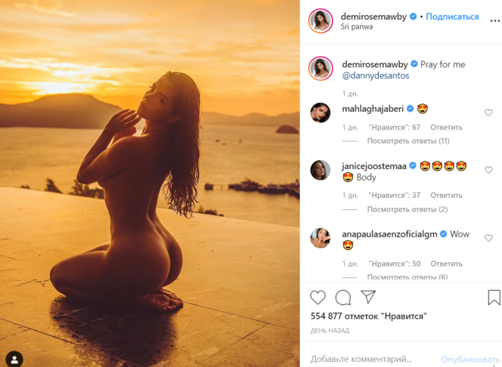 Роуз повысила градус откровенности, оставшись перед камерой полностью обнаженной. Фотомодель позировала в лучах заката, показывая соблазнительные изгибы. Она оставила свои длинные мокрые волосы распущенными и сделала выразительный макияж с акцентом на глаза. Образ завершили нежные украшения - серьги и кольцо на указательном пальце. «Помолитесь за меня», - отметила Деми.