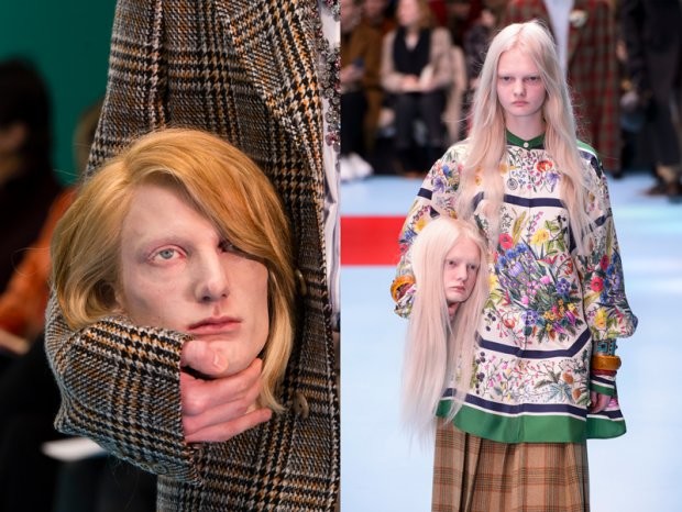 А все началось с того, что на неделе моды в Милане модели вышли на подиум с копиями своих «отрубленных» голов в руках в качестве аксессуара. Кроме голов, вместо клатчей демонстрировались детеныши драконов и змеи. Так они представили новую коллекцию Gucci. Головы были сделаны по заказу нового креативного директора Gucci Алессандро Мишеля.