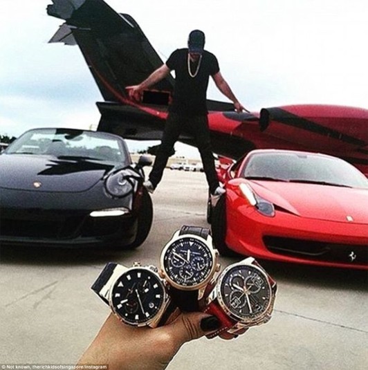 Молодые люди кичатся своими позолоченными автомобилями, брендовой одеждой, дорогими часами, самолетами и большими суммами денег