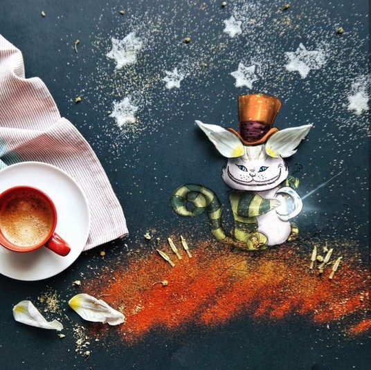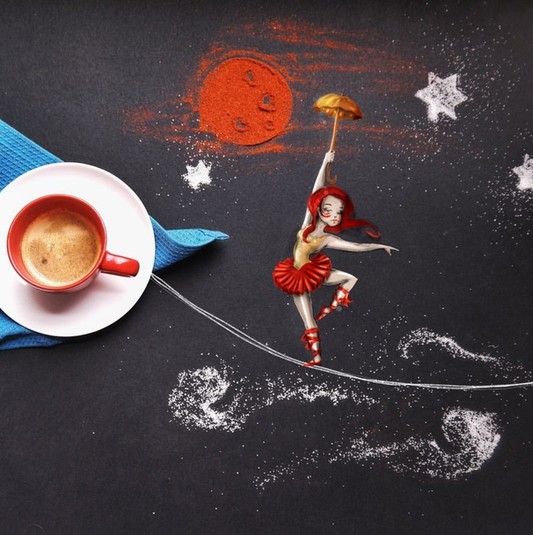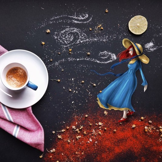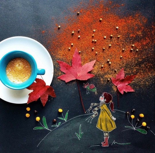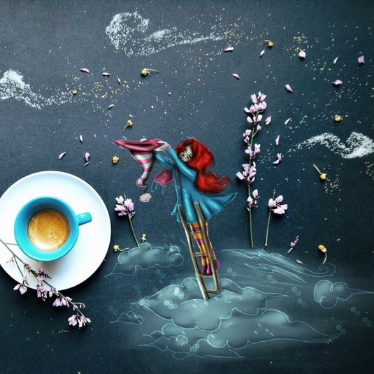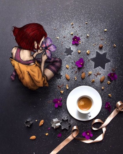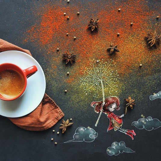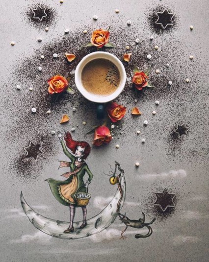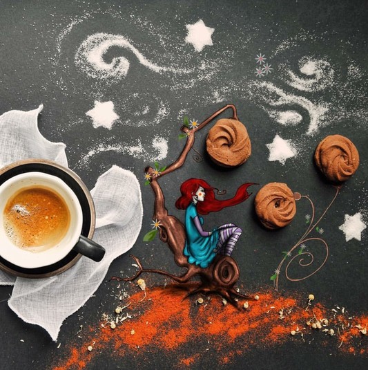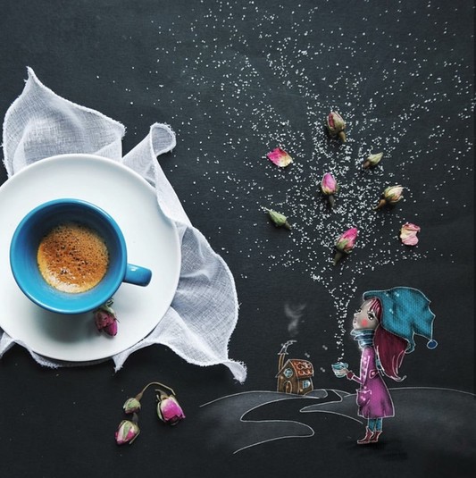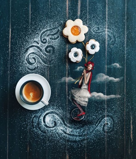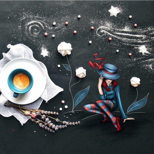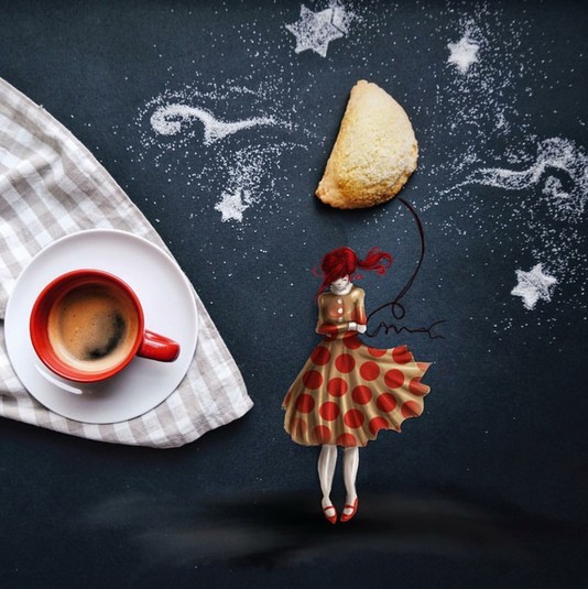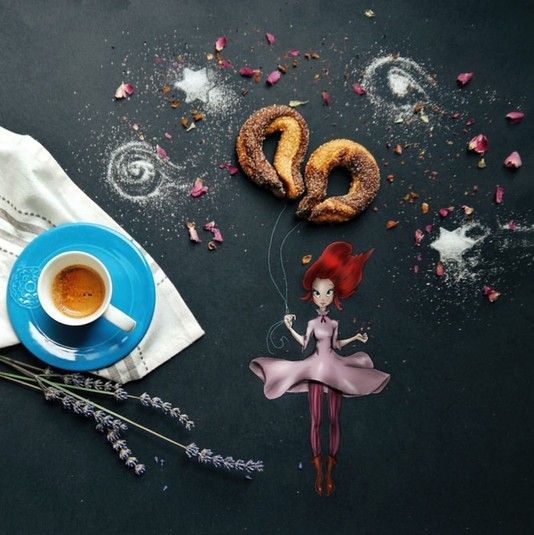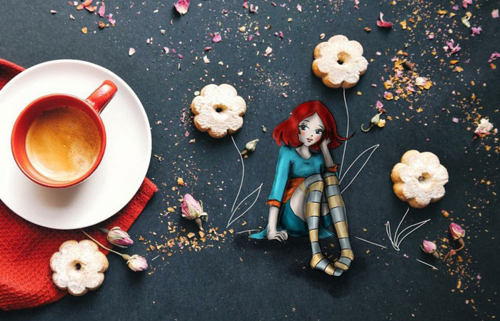 У Синсии же – это маленький (практически ежедневный) ритуал, который не обходится без ароматного кофе и рисования милых картинок, пополняющих её аккаунт в Instagram. Печенье и крендельки превращаются в воздушные шары, луну, месяц, цветочные лепестки и прочие милые штучки, клубника и апельсины преображаются в сочные яркие сердца, под которыми на перекладинах выполняют различные трюки хрупкие девочки в симпатичных костюмах, а сахар на глазах трансформируется в звёздное небо, ветра, пушистые облака и снежные заносы, создавая вокруг очаровательную сказку с милыми персонажами, излучающими тепло.