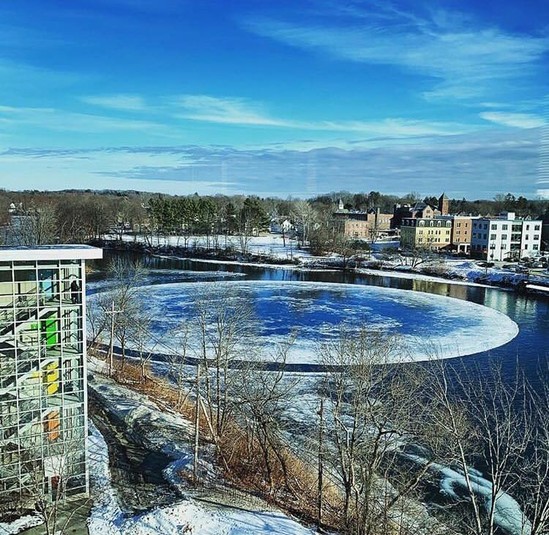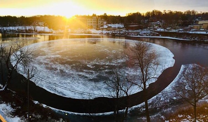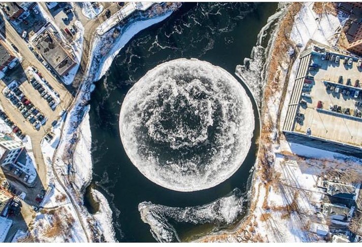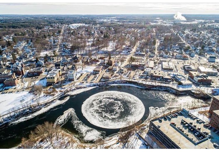 Жители небольшого городка Уэстбрук с населением в 16 тысяч человек, штат Мэн, столкнулись с необычным природным явлением: на реке Пресумпскот около города образовалась льдина диаметром в 90 метров.