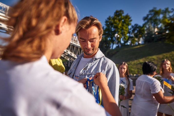 Затем Владимир Зеленский направился к колоколам под пешеходным мостом, где ребенок, чей отец погиб ровно год назад, защищая страну, запустил перезвон колоколов в разных городах Украины. В этой же части, саунд-продюсером которой выступил Евгений Филатов (The Maneken), возложение цветов погибшим сопровождалось вокализом и игрой на свирели от Onuka.